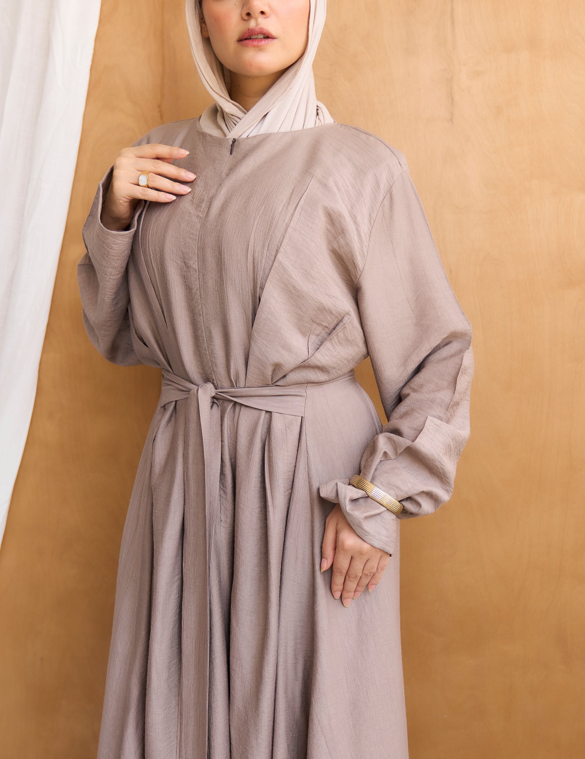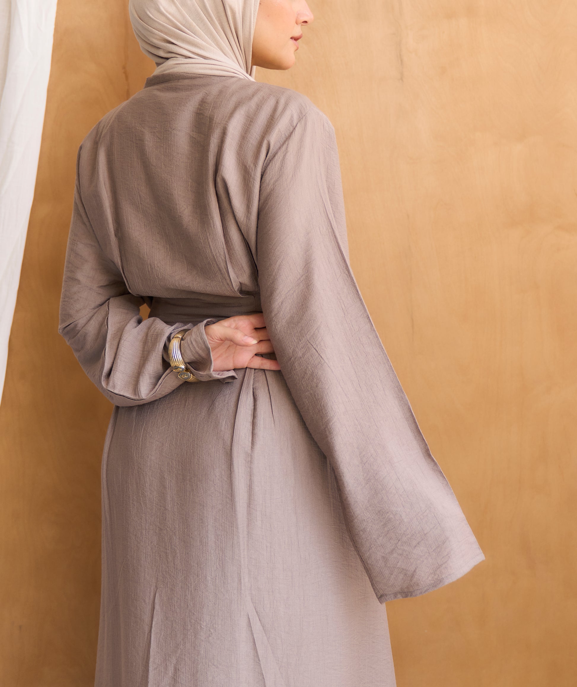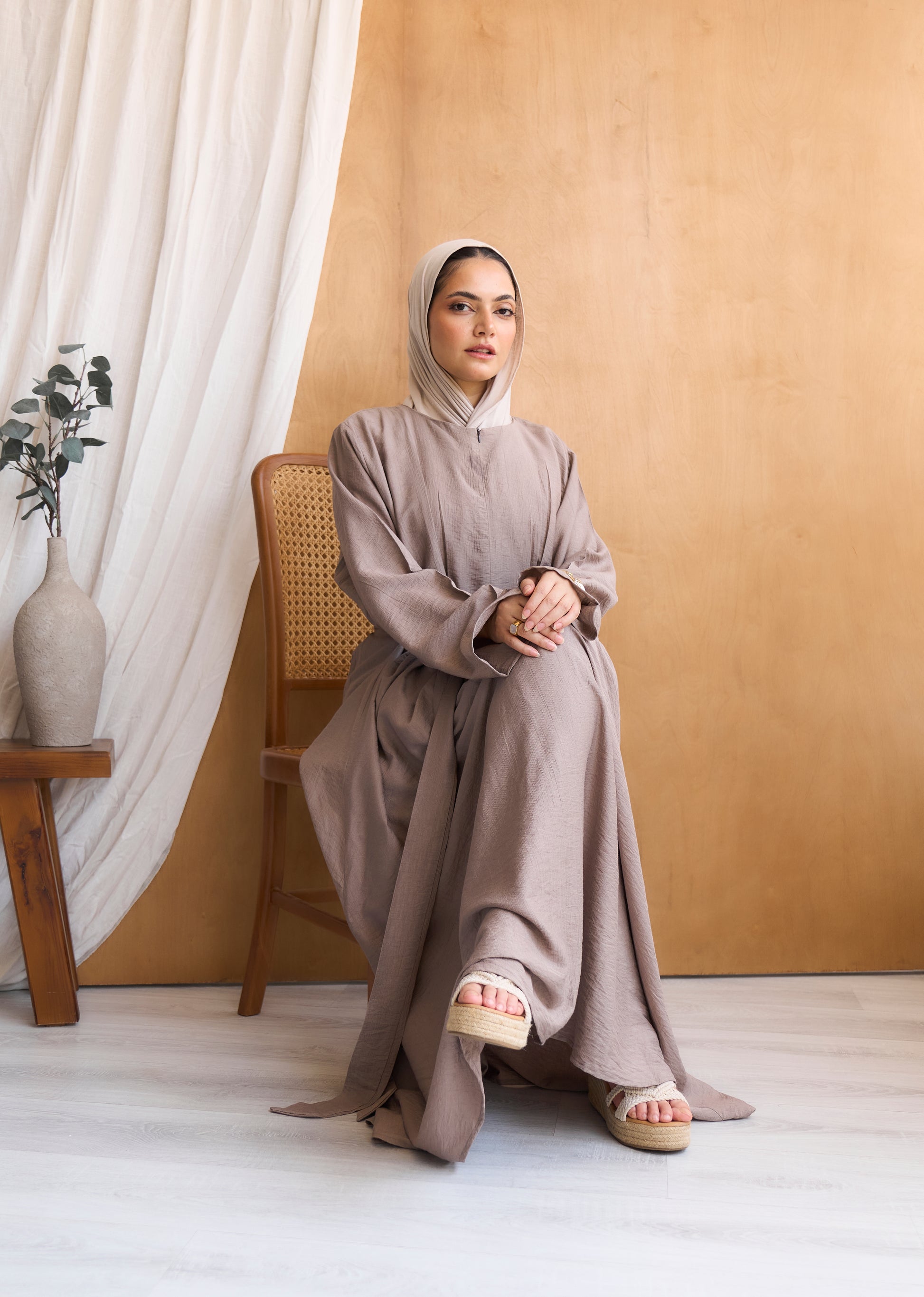 - Structured yet soft, this Maxi Dress brings graceful form to everyday dressing. Crafted in a subtle mocha hue, this full-length silhouette features wide sleeves and a clean round neckline, striking a balance between modesty and modern refinement.