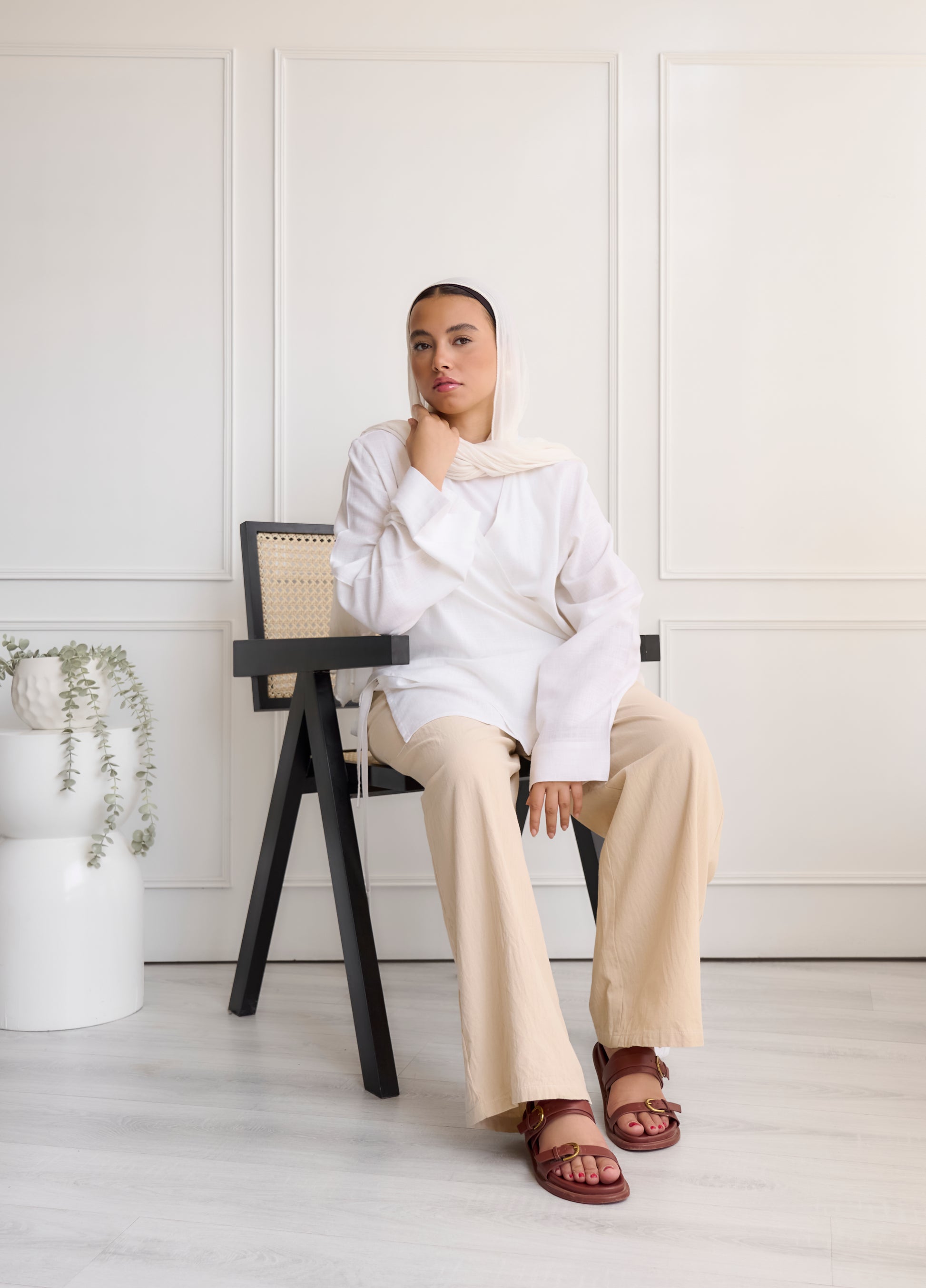 High-waisted trousers or a flowing skirt and minimalist |
